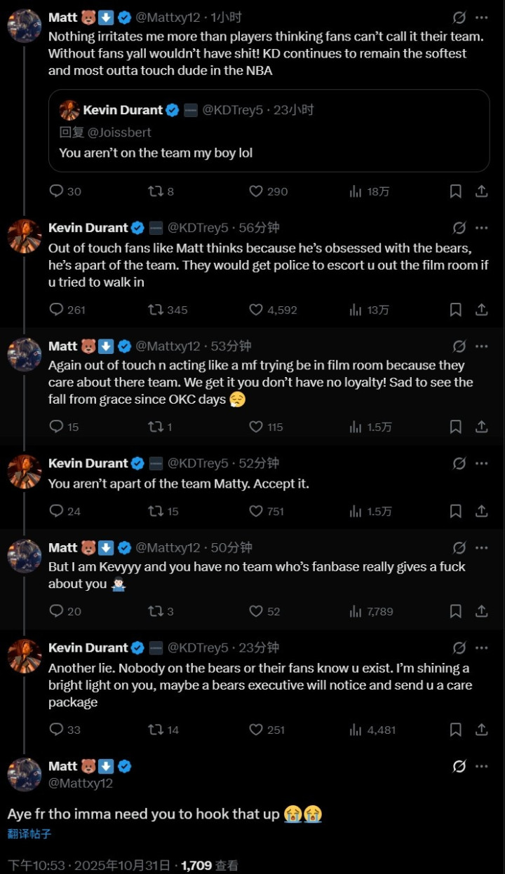 杜兰特回复:又一个谎言。熊队和他们的球迷根本不知道你的存在。我这是在曝光你,说不定熊队的某个高管会注意到你,然后给你寄个慰问包裹呢。
