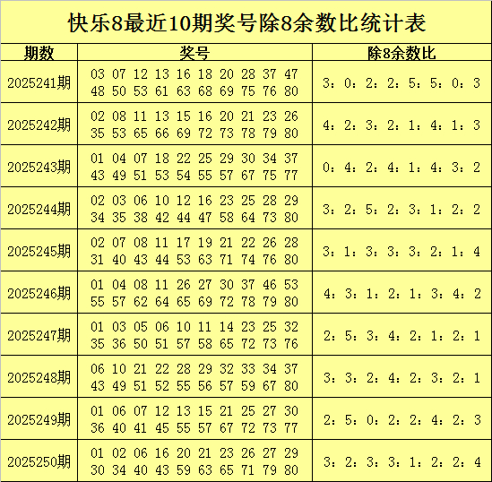 福彩快乐8第2025250期开奖回顾:01 02 06 16 20 21 23 26 27 29 30 34 40 43 59 63 65 71 79 80,其中奖号除8余数比为3:2:3:3:1:2:2:4。