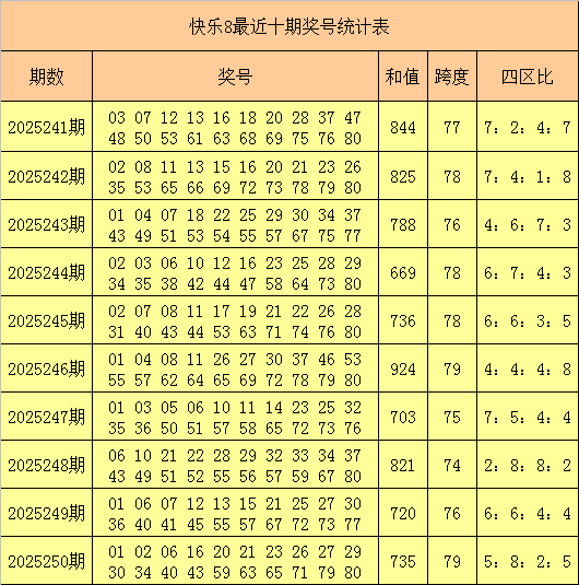 快乐8第2025250期奖号开出:01 02 06 16 20 21 23 26 27 29 30 34 40 43 59 63 65 71 79 80,其中奖号和值为735,跨度为79,四区比为5:8:2:5。