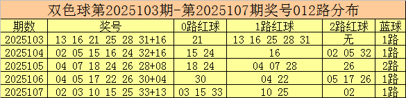 开奖回顾:双色球第2025107期开出奖号:02 03 10 15 25 33 + 13。其中,红球号码012路比为3:2:1,其中0路号码表现活跃。蓝球号码为1路号码。