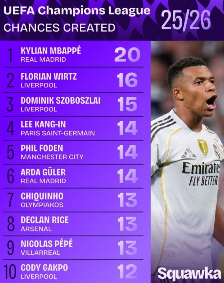 本赛季欧冠创造机会榜: 姆巴佩20次居首, 维尔茨次席, 索博第三